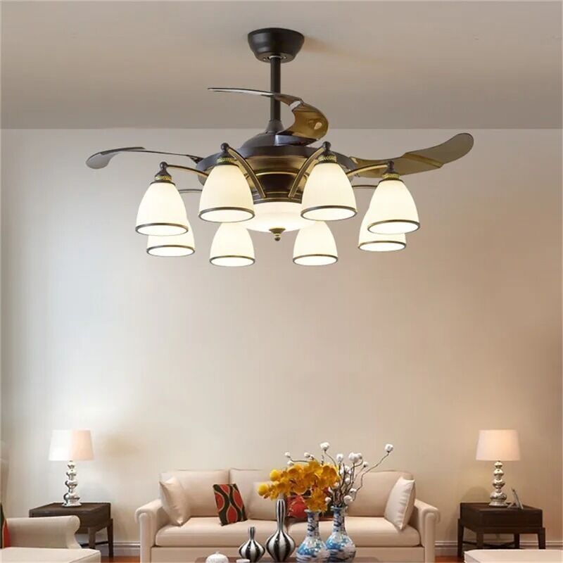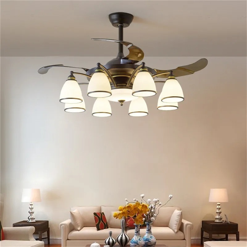Lâmpada de ventilador de teto de luxo LED remota Lâmpada de ventilador elétrico com estrela de vidro Lâmpada de metal Lâmpada de ventilador furtiva (WH-VLL-28)